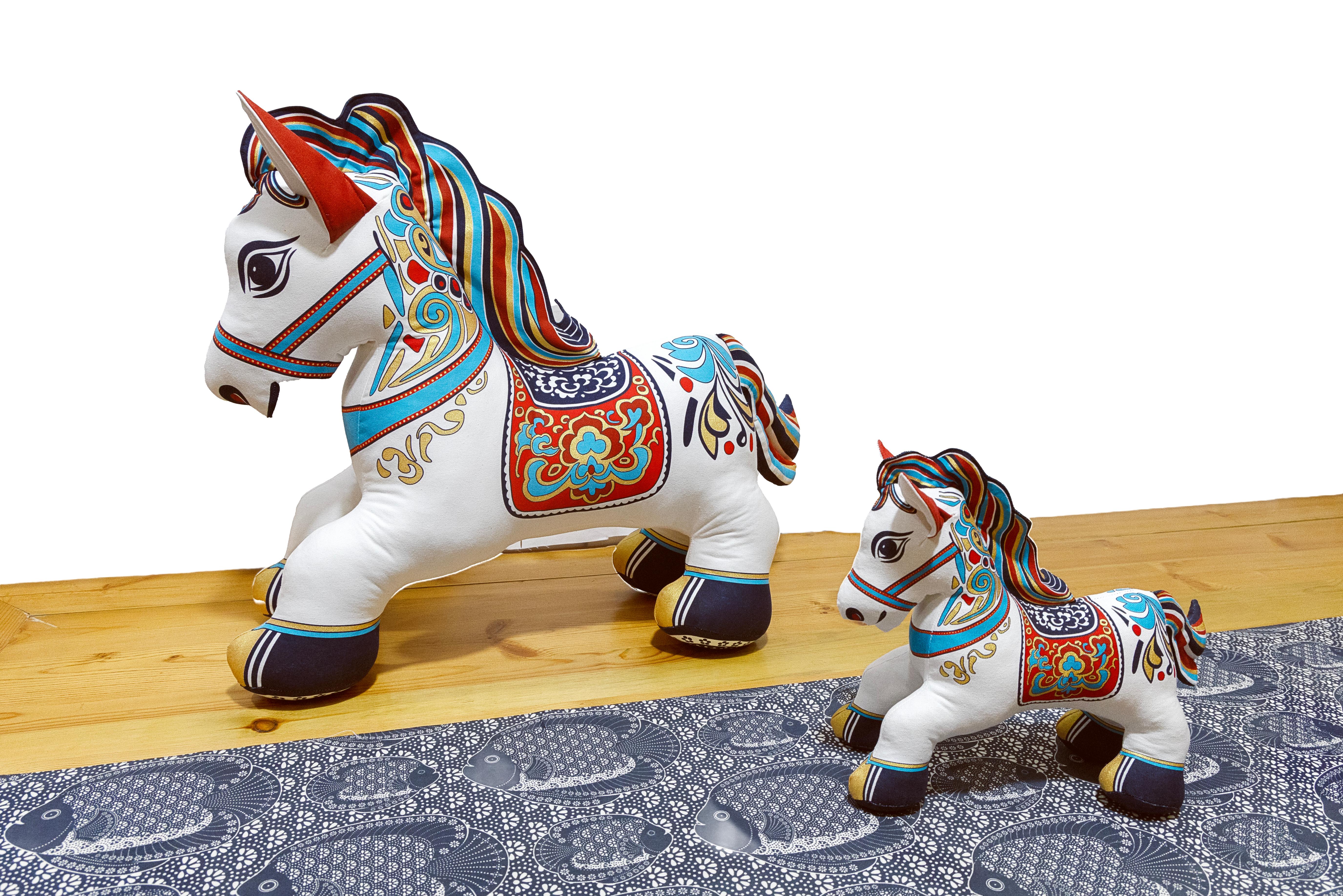 在工艺设计上,作品践行“传统为根、现代为魂”的创作理念,坚守手工丝网印花的非遗精髓,通过丝网制版、油墨刮印等传统工序,将唐代宝相花、卷草纹、缠枝莲等经典纹样精准复刻于布艺之上,清晰灵动,色彩饱满,兼具历史厚重感与艺术美感,让千年纹样焕发当代活力。造型设计兼顾雄浑神韵与亲和质感,圆润流畅的线条搭配柔软布艺材质,既保留唐马的雍容气度,又呈现出憨态可掬的视觉效果,适配节庆陈设、文化传播、礼赠往来等多元场景。